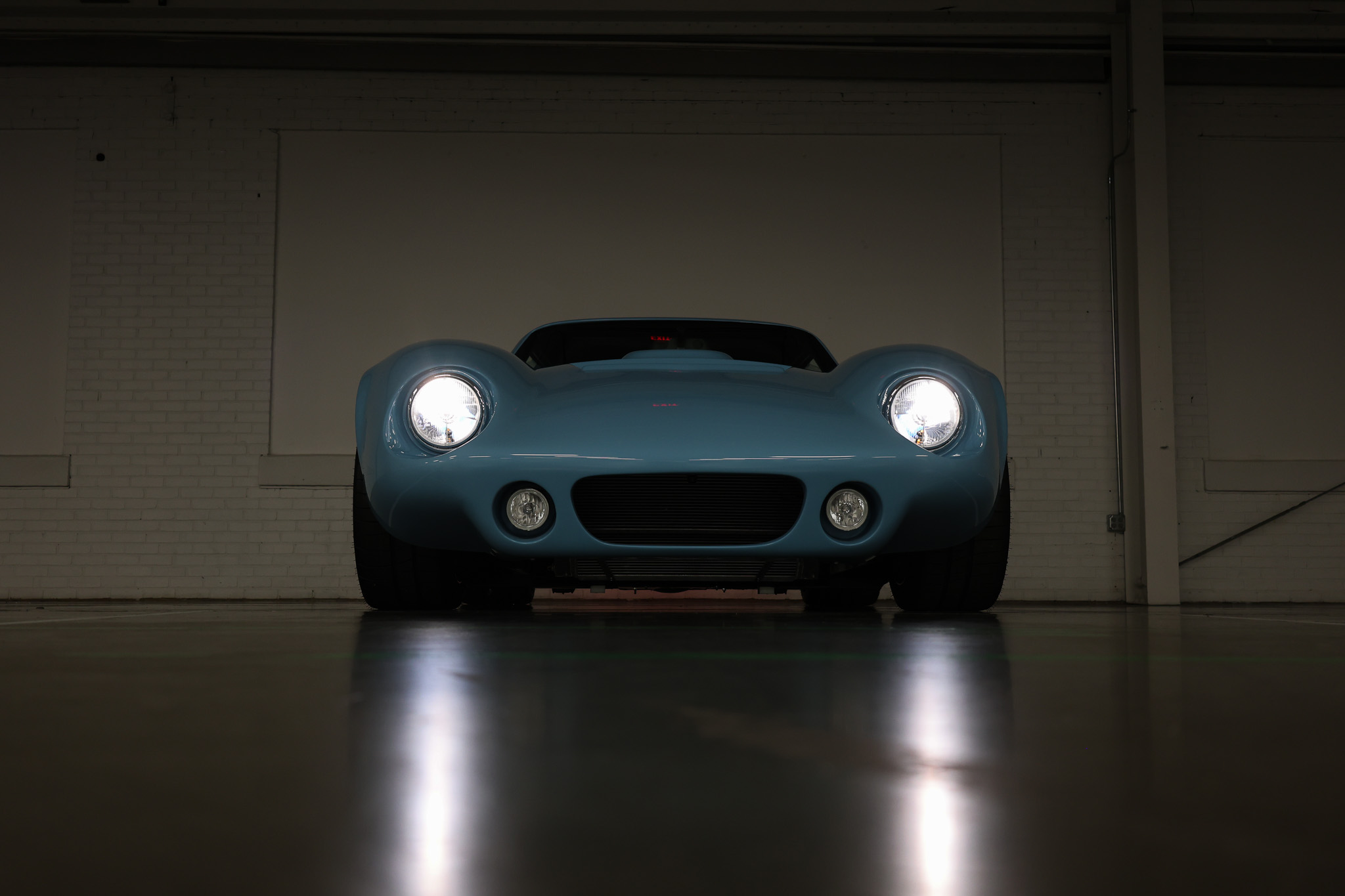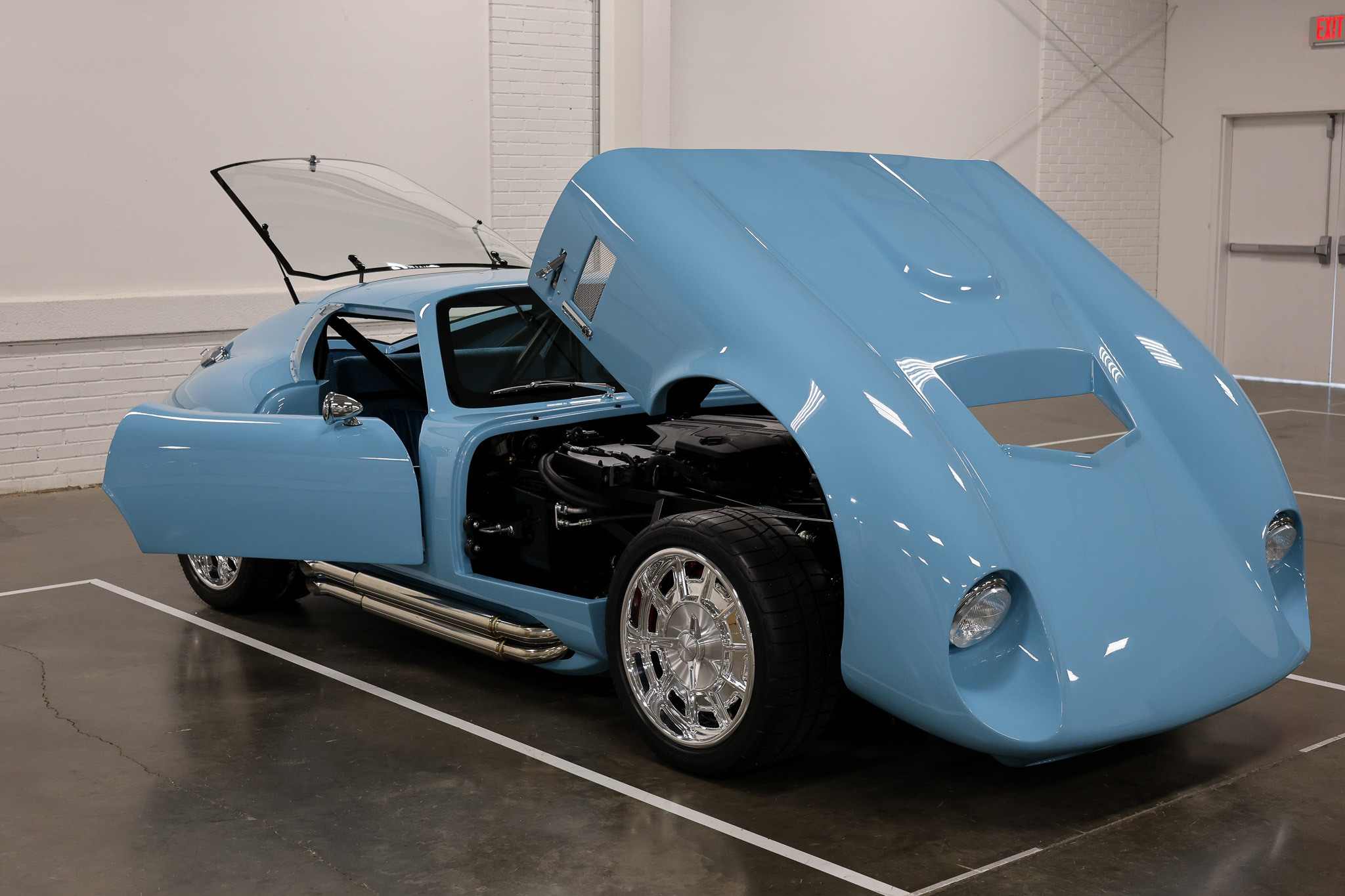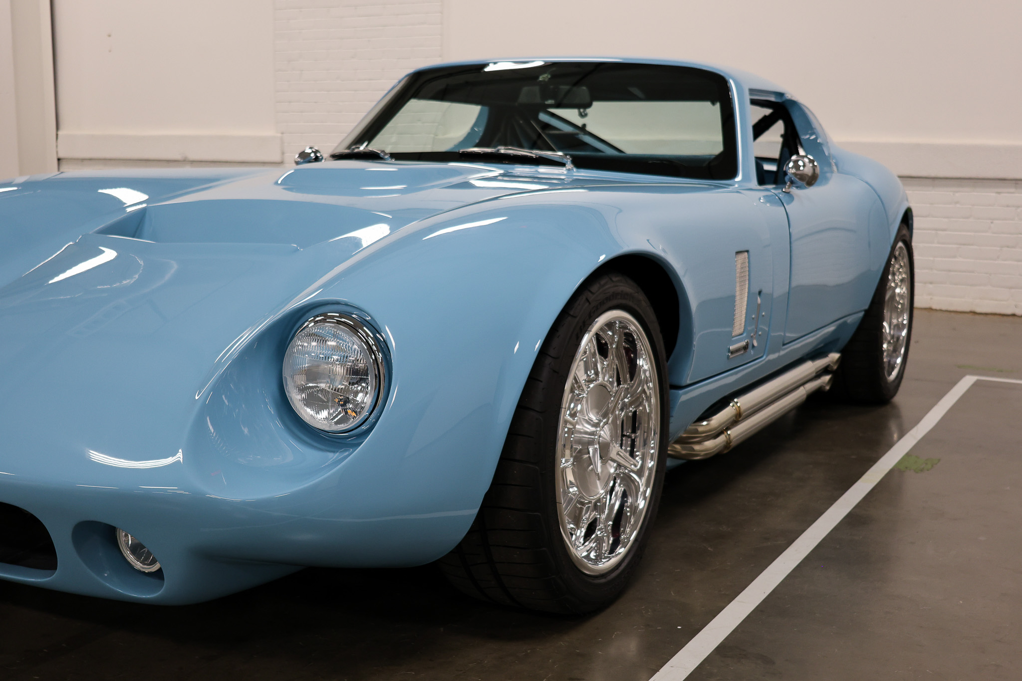 Powered by a Coyote Gen 3 engine by Ford Performance paired with a Tremec 5-speed transmission, this Type 65 Coupe delivers modern muscle beneath its iconic silhouette. A Ridetech air suspension system ensures both precision handling and ride comfort, while Schott Performance custom wheels complete its bold stance. Inside, drivers will find a custom-designed dash and switch panels, along with an advanced front and rear camera system by Metra—a unique feature in a vehicle of this class.Finished in a custom light metallic blue, with a luxurious medium blue Reno leather interior, the car seamlessly blends timeless Daytona Coupe heritage with contemporary performance and innovation.